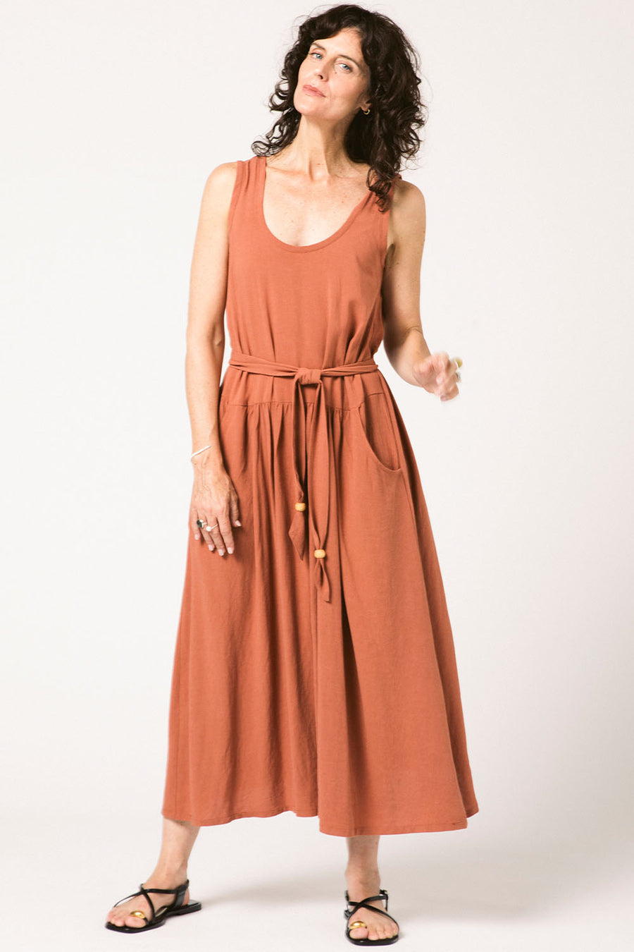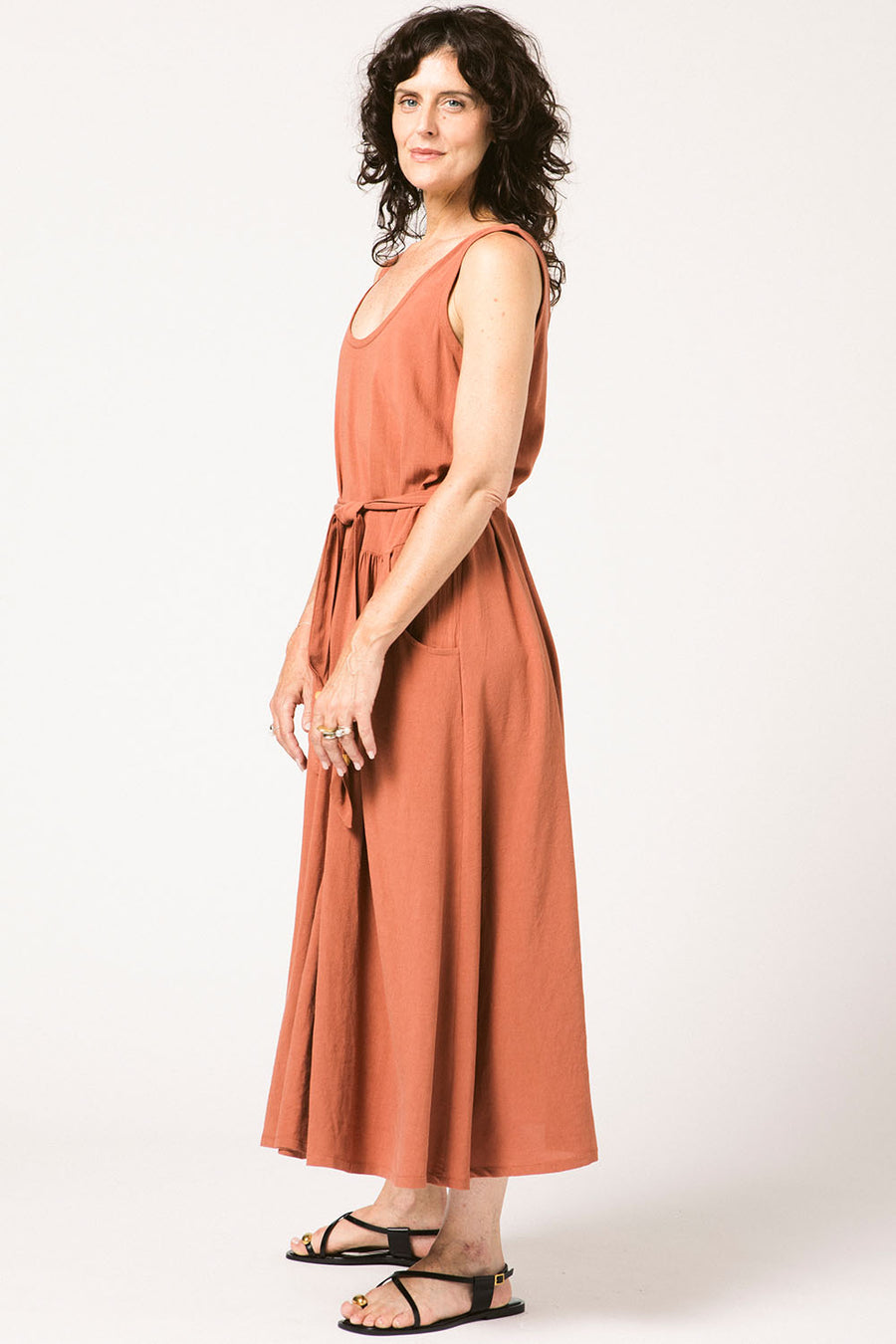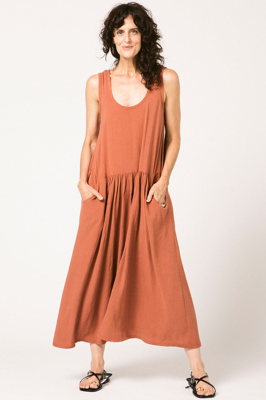 A maxi tank dress with a lot of volume. The front has a seam with gathers and pockets just below the natural waist. The gathers in the front are placed low enough to be seen when wearing its matching belt. Or wear it with a different belt. Or no belt. The fabric has a beautiful drape.