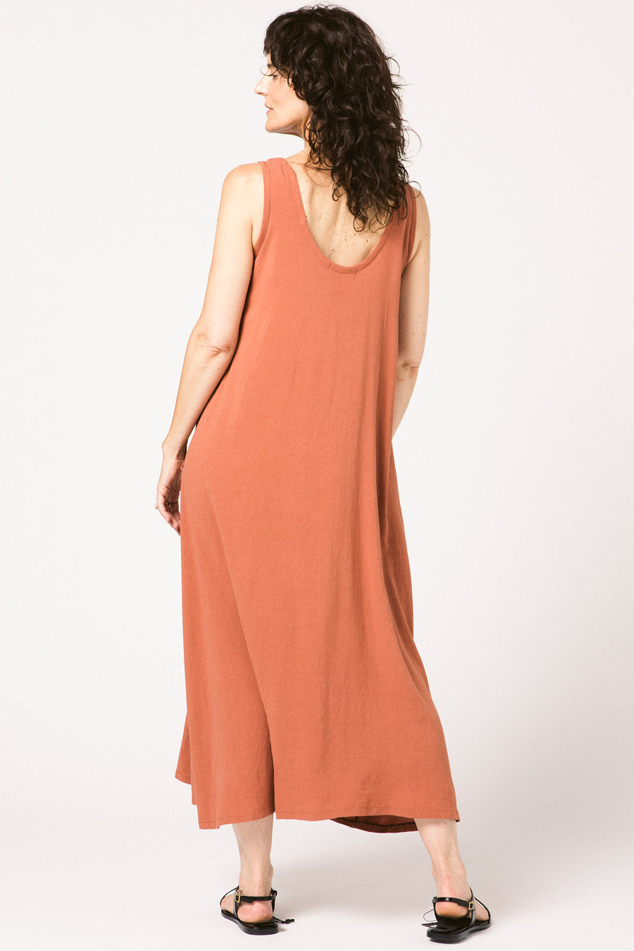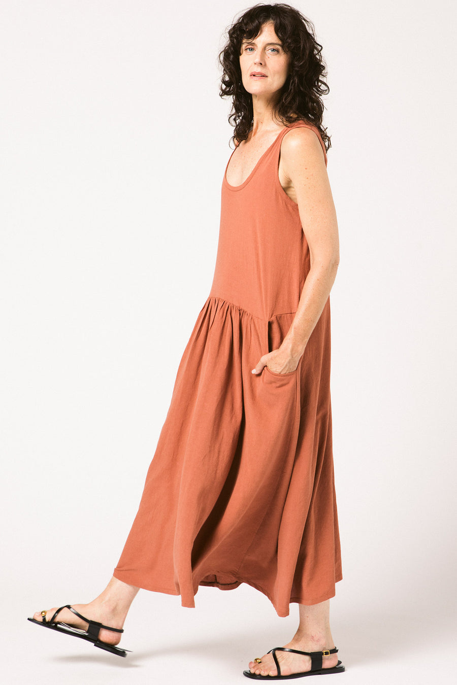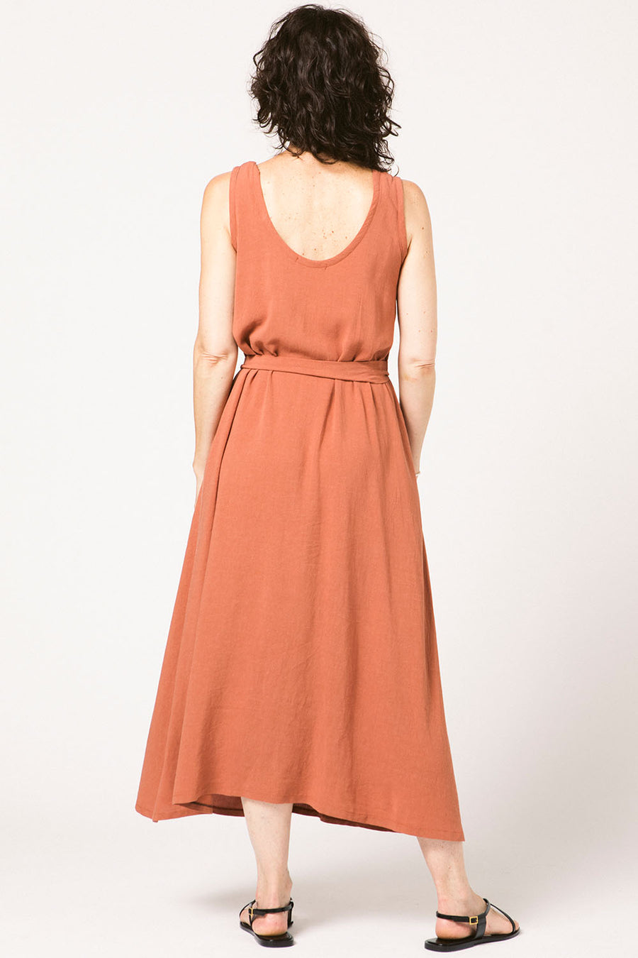 A maxi tank dress with a lot of volume. The front has a seam with gathers and pockets just below the natural waist. The gathers in the front are placed low enough to be seen when wearing its matching belt. Or wear it with a different belt. Or no belt. The fabric has a beautiful drape.