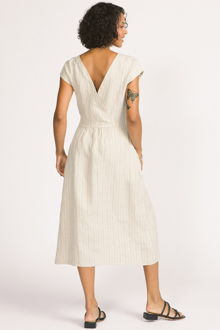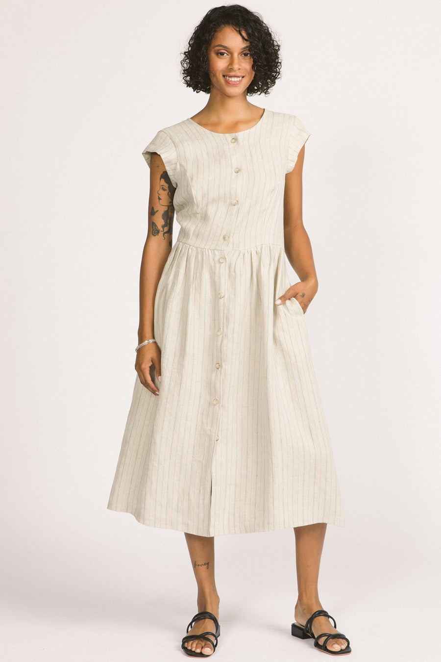 A scrumptious linen midi dress with pockets, buttons up the front and a cap sleeve. It has a wrap back to show some skin but still cover bra straps. This dress can go to work or to a chic party.
