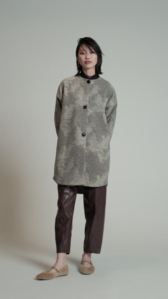 A bomber-inspired longer jacket with ribbed trim around neckline and cuffs, as well as button front closure. Wear it as a cardigan type layering piece inside or as part of your winter jacket situtation. The fit is oversized to accommodate cozy winter sweaters. It has side seam pockets.