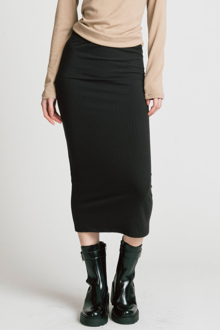 A tube skirt! What more to say! It’s longer than our usual version and made from a thick fuzzy rib. Make it a set with the Trigger Mock Neck - then add the Support Cardi overtop.