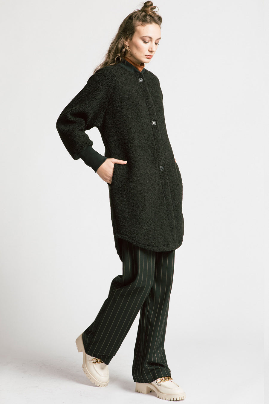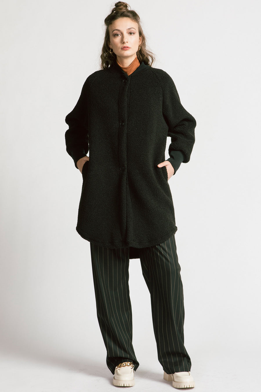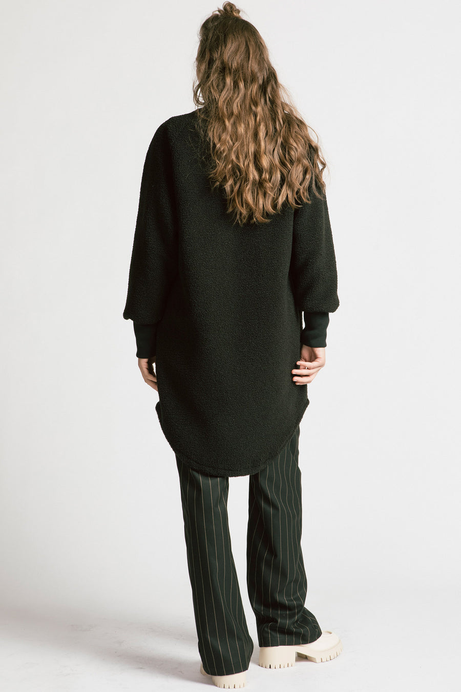 Cozy extra-long bomberesque fleece jacket. It has in seam pockets and three buttons for a closure. The fleece is THICK and soft! The outside of the jacket has a shearling look while the inside is warm smooth fleece. Wear it inside as a cardi, outside as a jacket or as a winter layer.