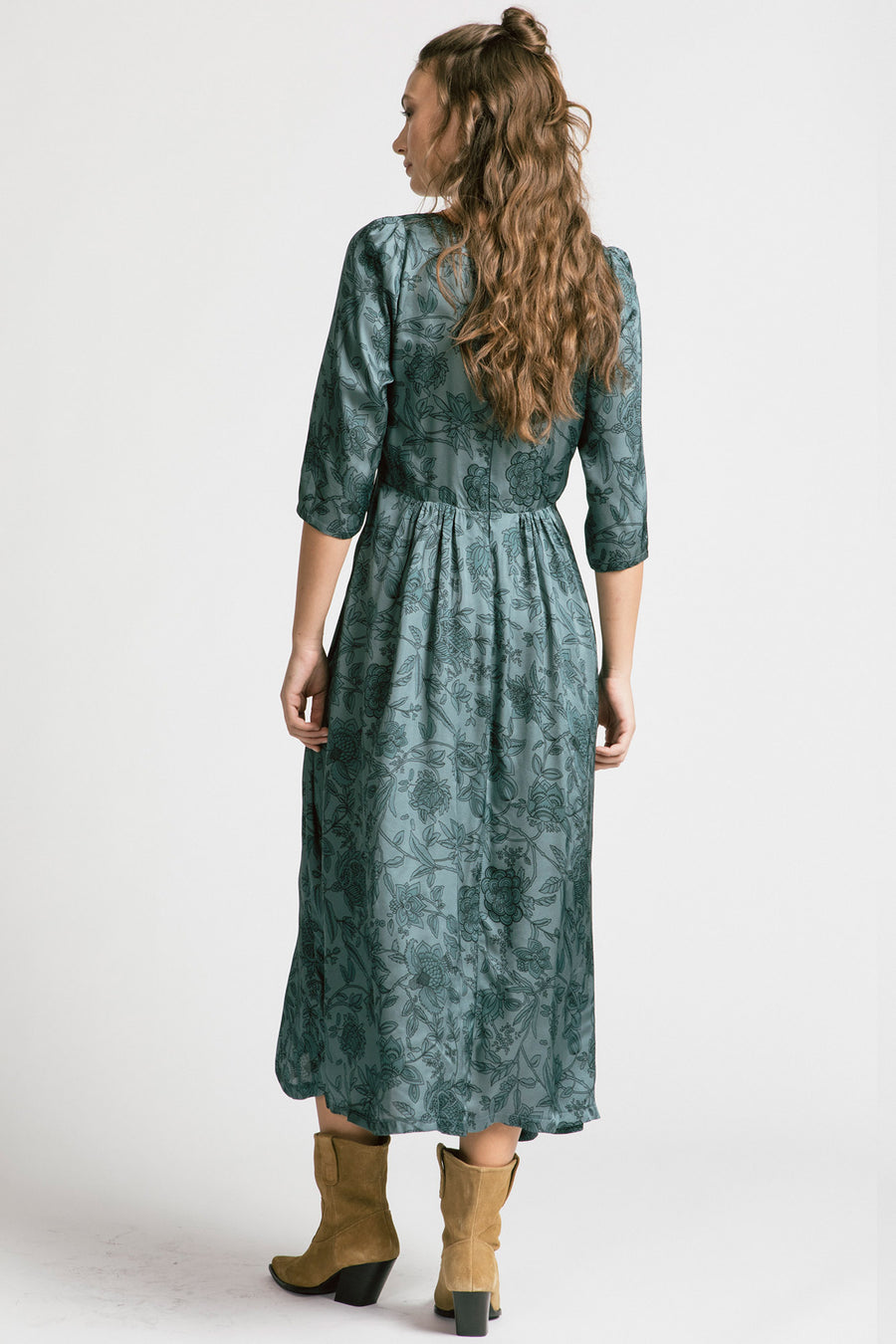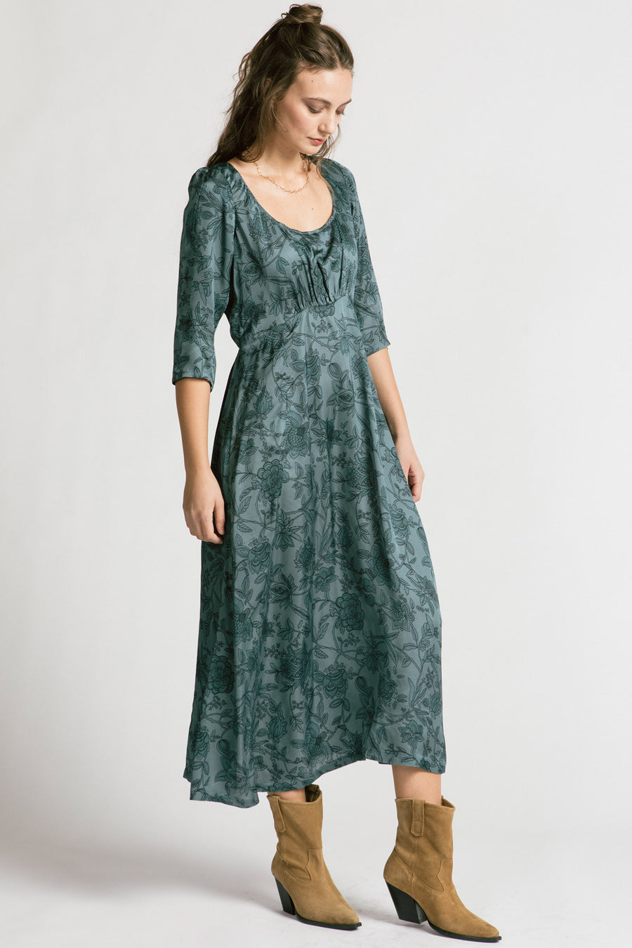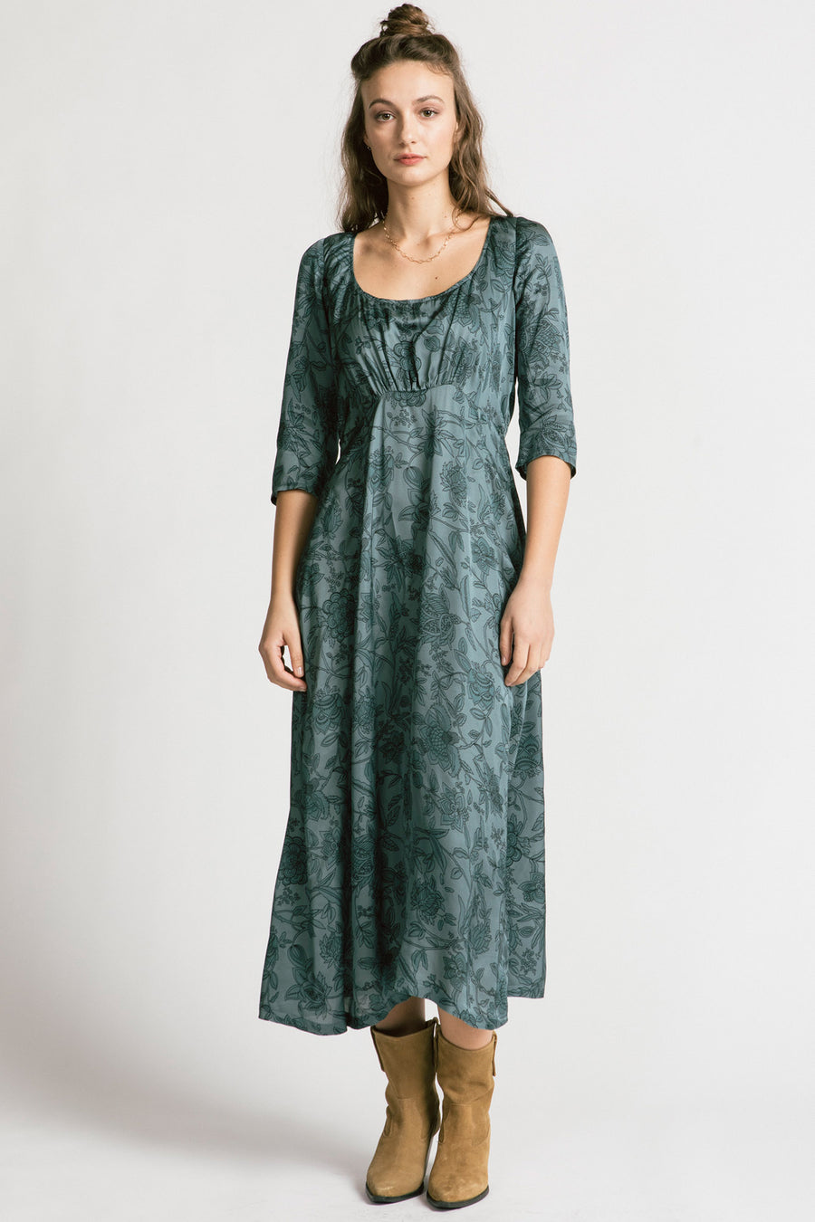 A dress for many occasions, it can be dressed up or down, but it always remains a little glam. There is a cinched empire waist seam with scoop neck and gathers at the bust. The princess seam skirt is full and drapes around the body. Sorry, no pockets, don’t hate me! It keeps the hip streamlined; you’ll need a little purse.