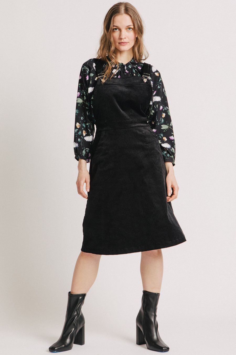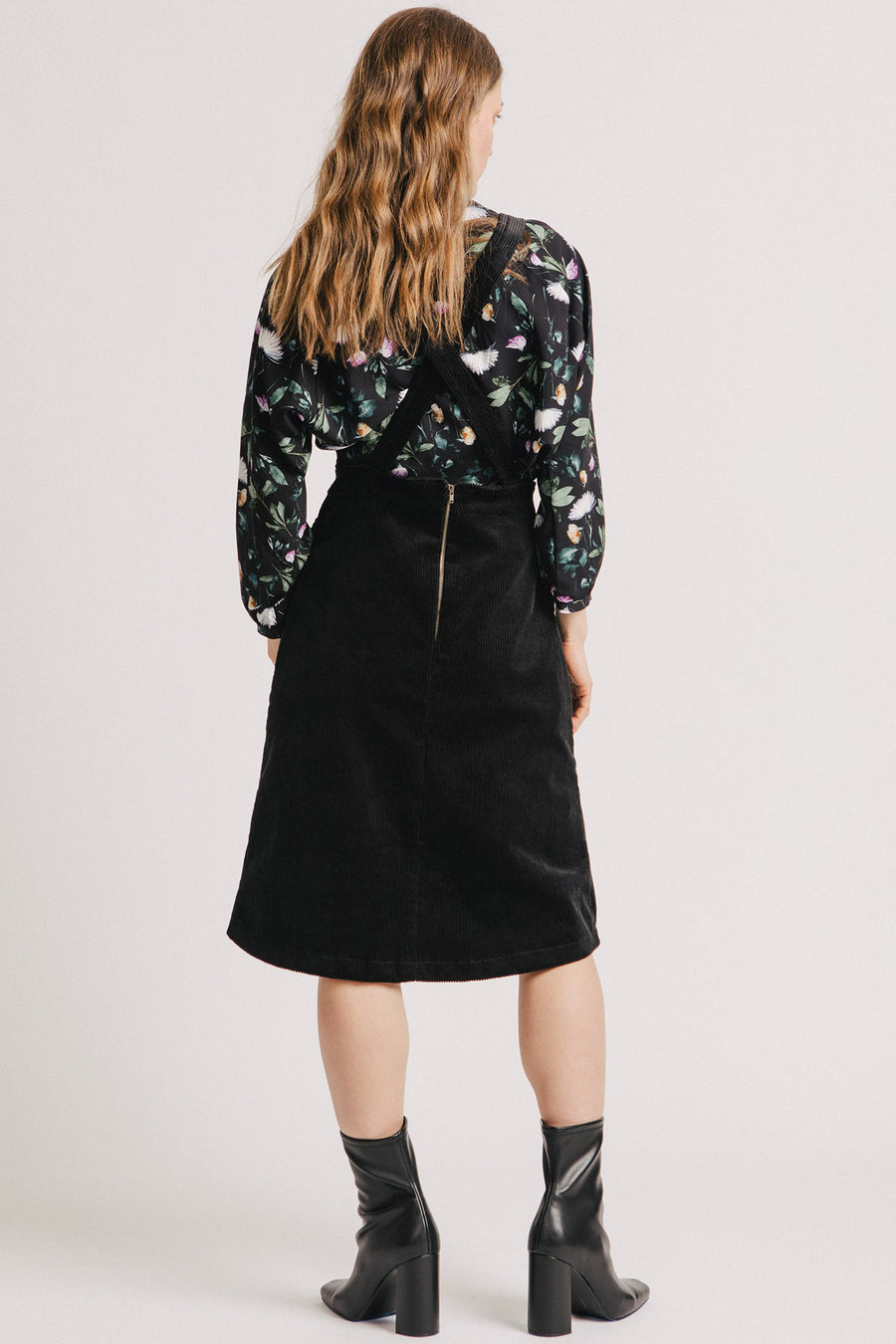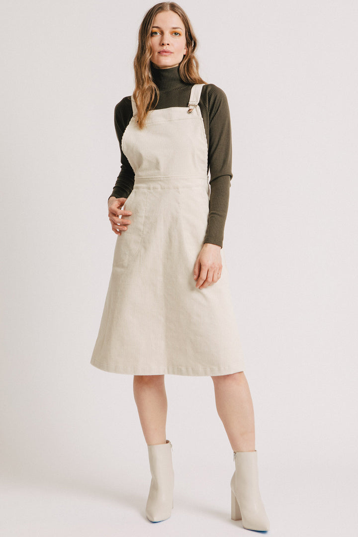 A fitted overall dress with a not quite pencil not quite Aline skirt. It has front pockets and a back zip. The straps are adjustable and crisscross in the back. Looks cute with a turtleneck or a flouncy blouse underneath.