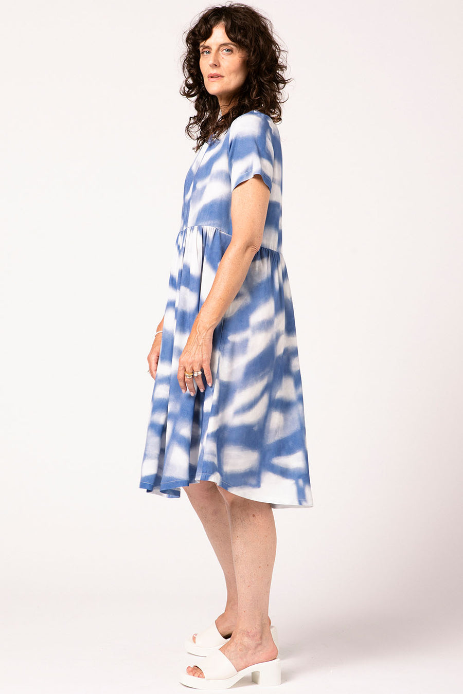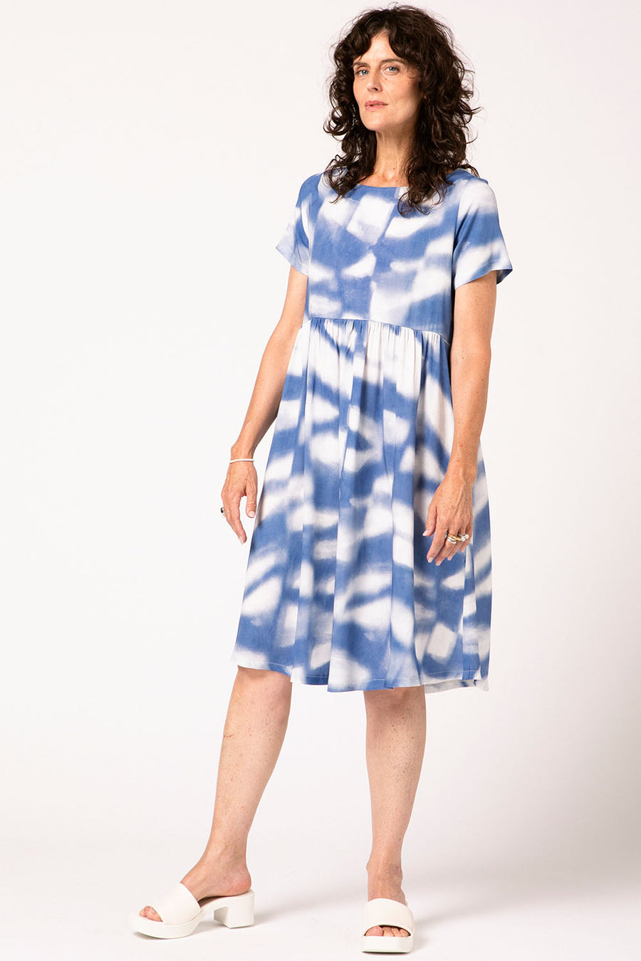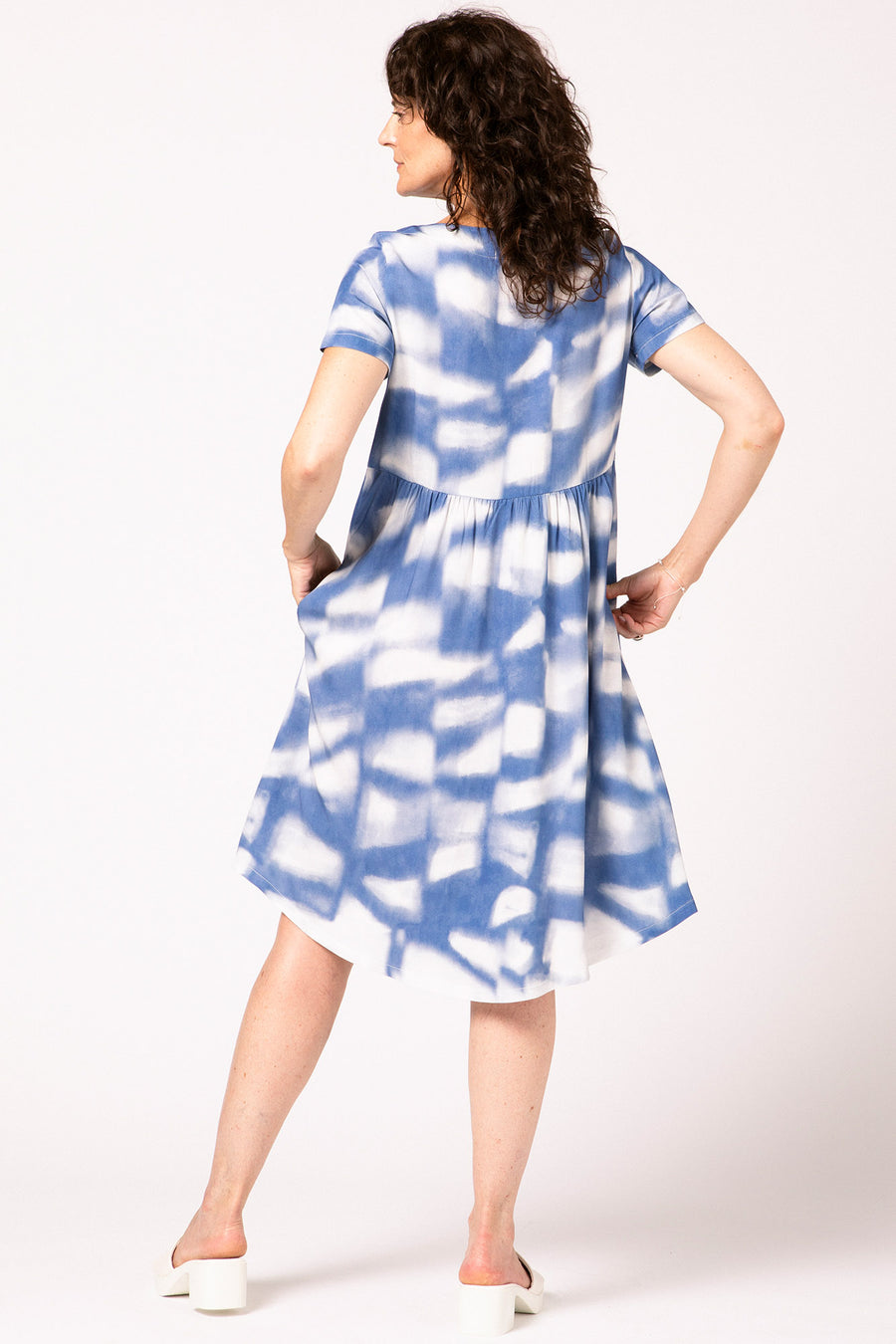 A very full, very fun and very swingy baby doll dress. It has a lot of gathers in the skirt with side seam pockets. The hem is shaped. A perfect breezy wear-everywhere summer dress. A great travel dress, can be dressed up or down.