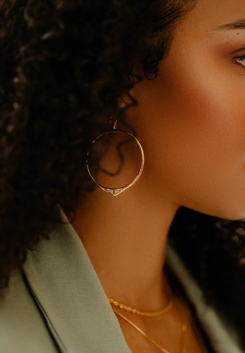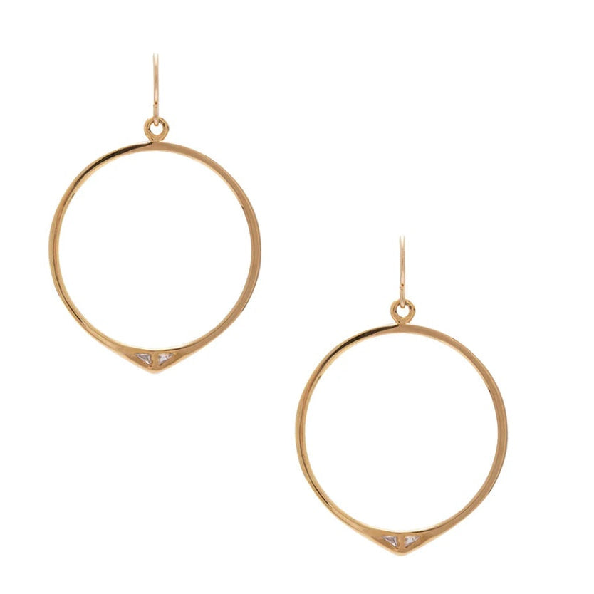 We love hoop earrings and these hoops are sure to stand out.  The simple circular shape of our Staff Party Earrings, accentuated by two triangle-cut Cubic Zirconia, give these hoops a little sparkle and the perfect subtle detail to add a bit of edgy-glam to your look.